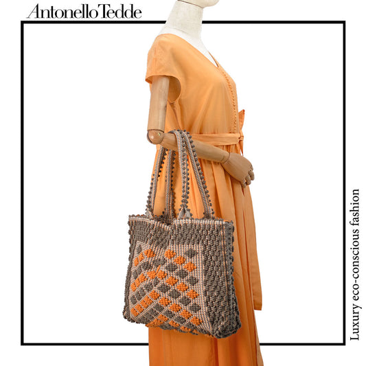 URTEI Rombetti. Ethically Crafted Sardinian Handwoven Cotton tote: Sustainable Elegance preserving traditions TAUPE and ORANGE bag